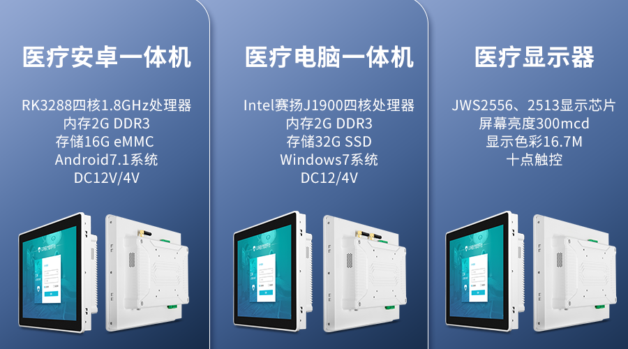 触想智能标准款工规医疗触控显示设备分3款:医疗安卓一体机、医疗电脑一体机、医疗显示器。总的来说,医疗电脑一体机,系统成熟,运行稳定,兼容性强;医疗安卓一体机,拓展性强,二次开发便利;医疗显示器,显示分辨率高,图像清晰。三款设备可以满足不同医疗场景需要。