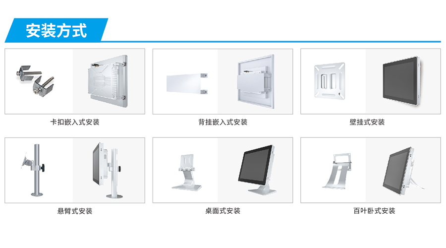 支持嵌入式安装、壁挂式安装、悬臂式安装,桌面式安装和百叶卧式安装,应用场景多,满足医疗环境下对不同尺寸和不同安装方式的需要。