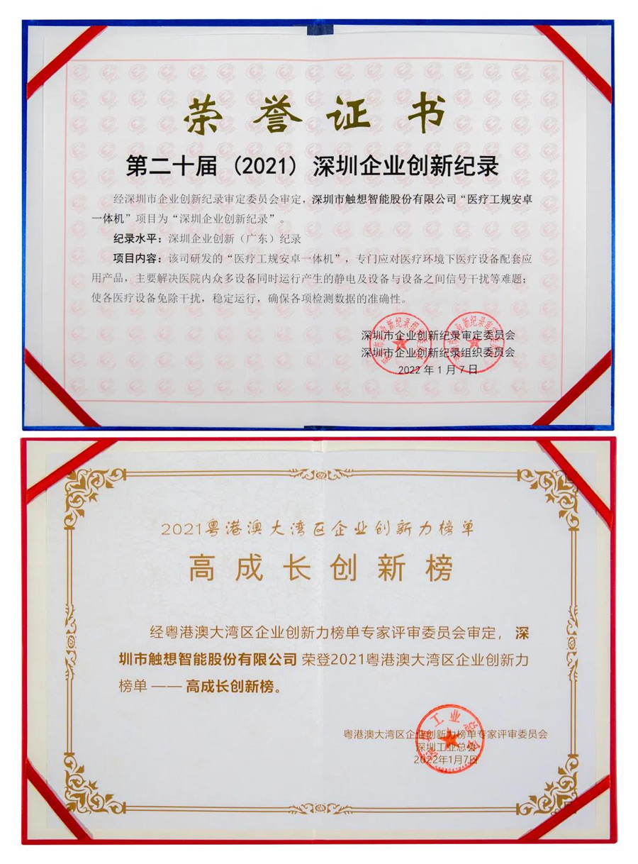 年末岁尾之际,触想智能再次获得荣誉,经深圳市企业创新纪录组织委员委、粤港澳大湾区创新力榜单评审委员会评定:触想智能获得“第二十届深圳企业创新纪录”荣誉,同时入选“2021粤港澳大湾区企业创新榜单——高成长创新榜”。