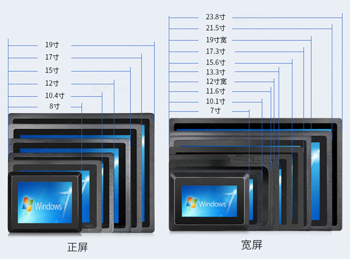 目前,嵌入式系列共有14个尺寸:7、8、10.1、10.4、11.6、12、12(宽屏)13.3、15、15.6、17、17.3、19、19(宽屏)、21.5、23.8。