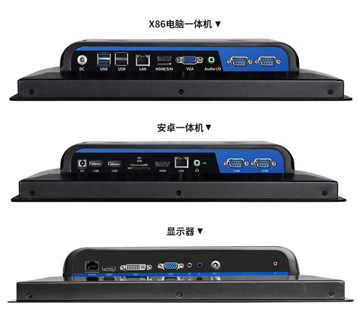 X86一体机下挡板接口从左到右则是,DC充电口,4XUSB接口,LAN局域网接口,HD/SIM储存卡槽,VGA视频输出接口,Audio I/O接口,2XCOM接口,上挡板预留2个COM口和双WIFI天线(12-19寸)