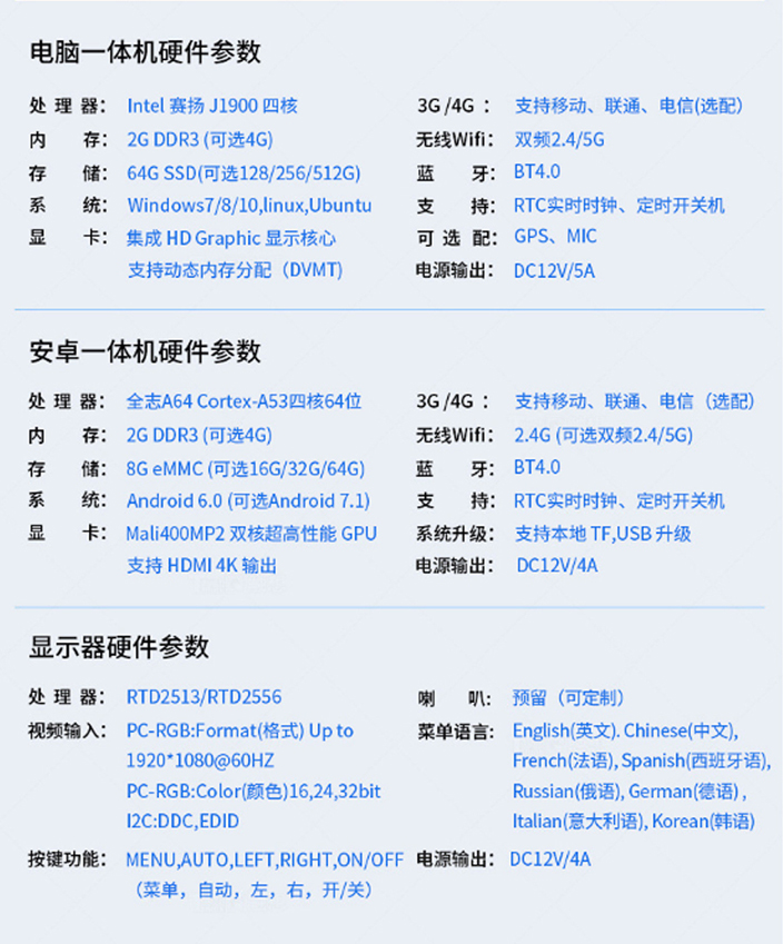 嵌入式配套产品系列配置参数,应用选择各不相同的系统,下面是三款产品的参数配置,可以根据应用需要进行升级定制。