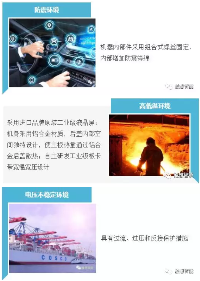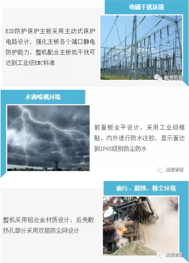 触想智能在原材料选型上非常严苛,采用国际知名品牌工业级显示芯片的设计,严格使用工业级耐压器件进行贴片,保证达到工业级宽压标准;产品整机利用绿色环保基材设计,增加抗干扰元器件、抗EMI材料涂层等设计方案。为触控自动化设备产品提供最核心的硬件设计,从根本上解决了高负荷稳定运行的要求。