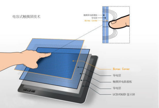 工作原理:电容屏实际上是利用人体电流感应工作的,可以理解为需要触摸介质带生物电才能触摸。也就是说,电容屏是利用下层发射讯号到上层,当上层被导体接触后,下层便能够快速接收讯息并作出计算。确定手指接触到的位置并作出反应。也正是因为如此,电容屏不仅可以同时支持多点,还大大提升了手触控时的灵敏度。因此电容屏多运用没有特殊需求的正常工业应用场景。