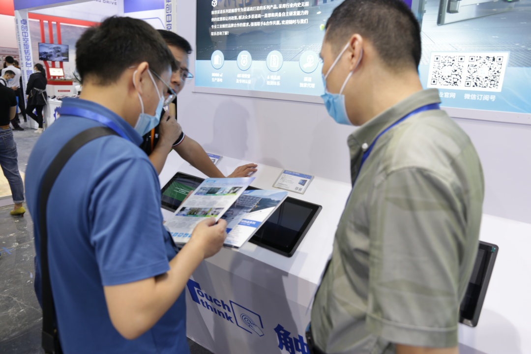 认真研读触想新品四折页的观众们,本次触想展出了触想5代、渠道系列、车载系列3大系列的新产品,根据应用方向不同各有侧重,但品质和工艺都是非常有保障的。
